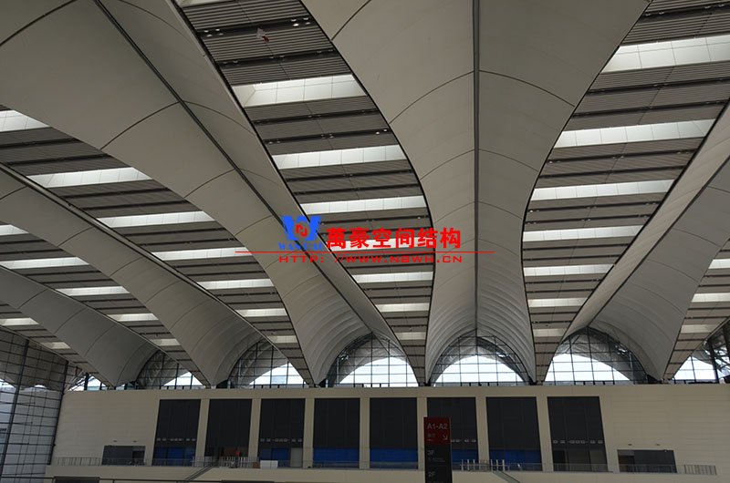 青島紅島國際會議中心幕墻膜結構工程,由寧波萬豪空間結構工程有限公司承建,現(xiàn)場測量、深化設計、制作及安裝由寧波萬豪全權負責。該工程用鋼量1000多噸,PTFE室內(nèi)屋面膜結構展開面積17000多平方米,PTFE室外屋面膜結構展開面積20000多平方米。