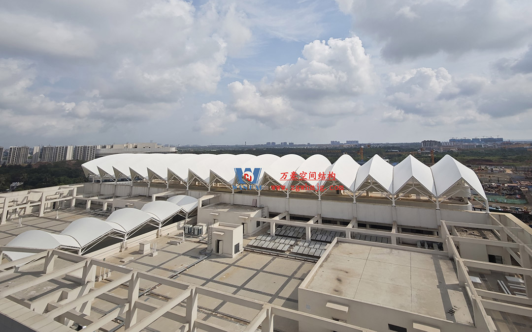 海南醫(yī)學(xué)院第一附屬醫(yī)院江東新院區(qū)膜結(jié)構(gòu)工程,該項(xiàng)目用鋼量約360噸,PTFE膜結(jié)構(gòu)展開面積約4500平米。