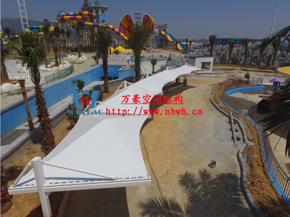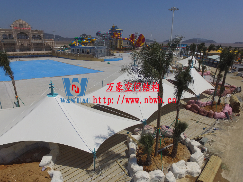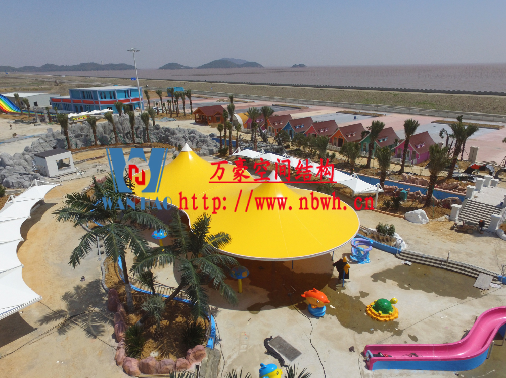 海闊天涳水世界位于浙江省象山縣大目灣新城,北與松蘭山國家“AAAA”級風景旅游區(qū)相接,東臨大目洋,南連東陳鄉(xiāng),距象山縣城8公里,成為大目灣新城最先動建的重大膜結構功能性項目,由寧波萬豪空間結構工程有限公司承建。現(xiàn)場測量、深化設計、制作及安裝由寧波萬豪空間結構工程有限公司全權負責;用鋼量高達180噸,建筑面積達5000平米。