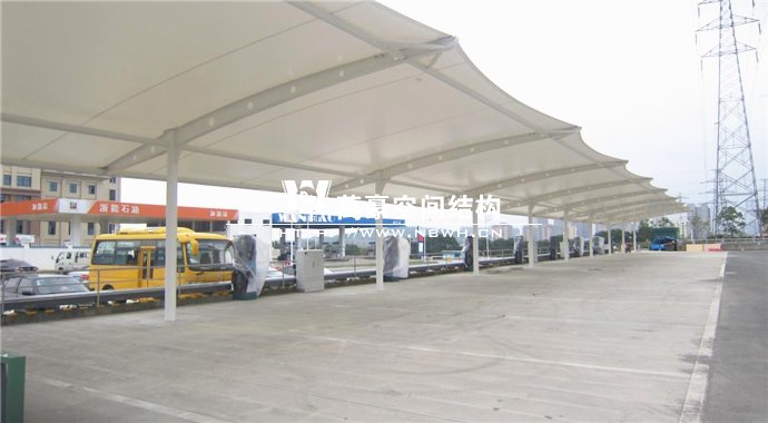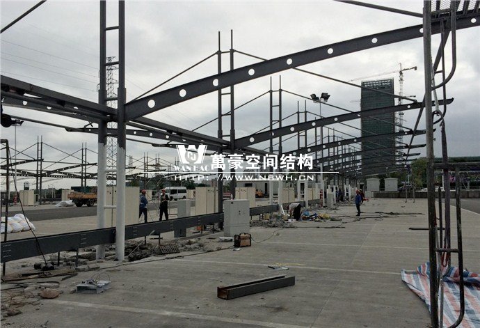膜結(jié)構(gòu)雨棚施工面積約5138平方;用鋼量約80噸。施工難點在于工期緊。施工時天氣情況差,連續(xù)的陰雨天給鋼構(gòu)的油漆施工帶來了極大的麻煩并且延誤了工期。雨棚底下還要安裝充電樁,我們還要和充電樁施工班組進行技術(shù)對接,規(guī)劃充電樁的安裝位置。由于工期緊,天氣狀況差,我們動用了兩個施工班組加班加點,土建、鋼構(gòu)交叉施工,最后如期完工。由于每個雨棚長度比較長,施工班組在立好鋼構(gòu)件之后從中間開始往兩邊安裝膜布,使工作效率有了很大的提高。