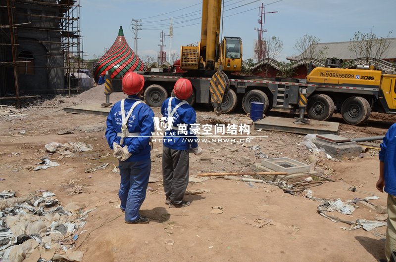 橫店俄羅斯館屋頂鋼結(jié)構(gòu)裝飾球吊裝 俄羅斯館鋼結(jié)構(gòu)階段 牡丹花仙湖看臺膜結(jié)構(gòu)工程效果圖
