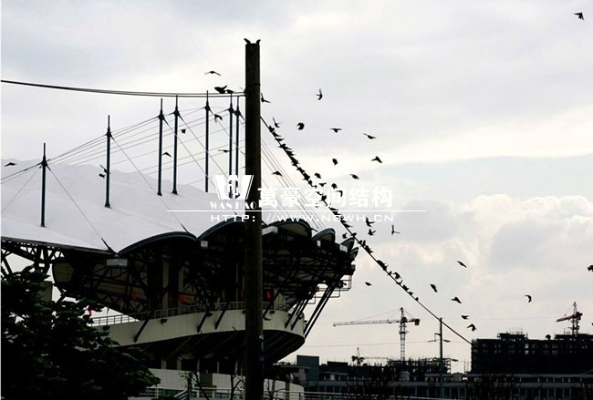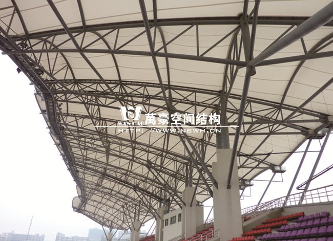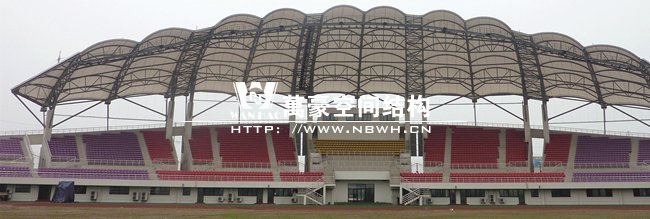 體育館膜結(jié)構(gòu)看臺工程總面積約7800平方米,地上一層,看臺主體高度為18.935米,挑棚最高處為23.2米,坐席數(shù)約5000個。