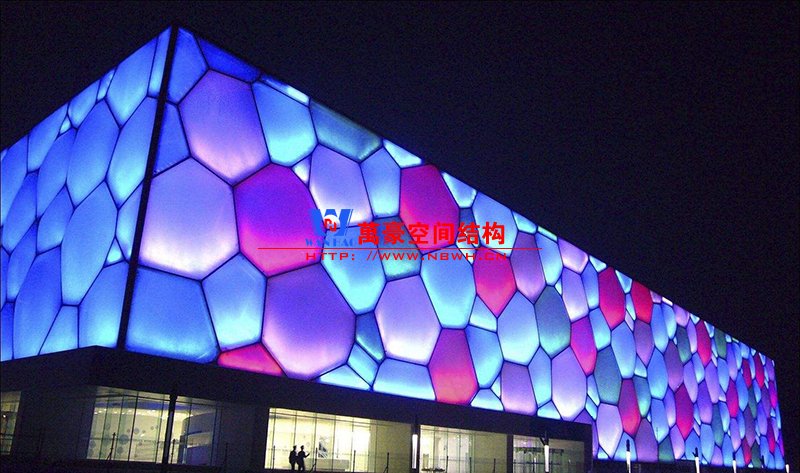 “水立方”就是一個(gè)非常典型的充氣式膜結(jié)構(gòu)建筑,它的外表由許多不同大小、形狀、矢高的ETFE氣枕組成,外層所使用的淺藍(lán)膜和內(nèi)層的鍍點(diǎn)膜在陽(yáng)光照射下讓ETFE氣枕出現(xiàn)兩個(gè)高光,更加體現(xiàn)出了水泡的特征。這種獨(dú)特的對(duì)光線控制的技術(shù),使得“水立方”成為了世界上獨(dú)特的建筑形式,展現(xiàn)出了前所未有的整體建筑的藝術(shù)效果。同時(shí)氣枕盡管大小不同,其矢高調(diào)剖控制在12-15%的跨度之內(nèi),這樣就是的整體效果此起彼伏,立體感更加的明顯,建筑的表現(xiàn)力更加的豐富。