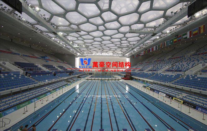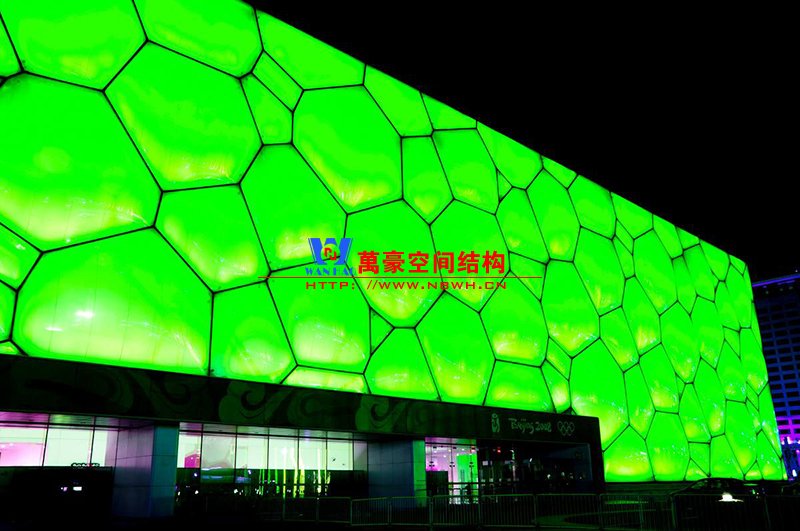 水立方是我國(guó)首次使用ETFE充氣式膜材料。在水立方尚未建造之前,我國(guó)還沒(méi)有在幕墻中使用ETFE膜材料的先例。水立方的整個(gè)建筑中除了入口處用了玻璃之外,其他地方全部采用充氣膜材料,內(nèi)部沒(méi)有一根柱子。ETFE充氣膜材料在歐洲有十多年的運(yùn)用歷史,基本上都是用在游泳館和冬季花園建筑方面的,它質(zhì)量輕、保溫隔熱性好,同時(shí)還有透光、防雨、自潔等特點(diǎn),最大的充氣膜材料建筑達(dá)3萬(wàn)平方米。