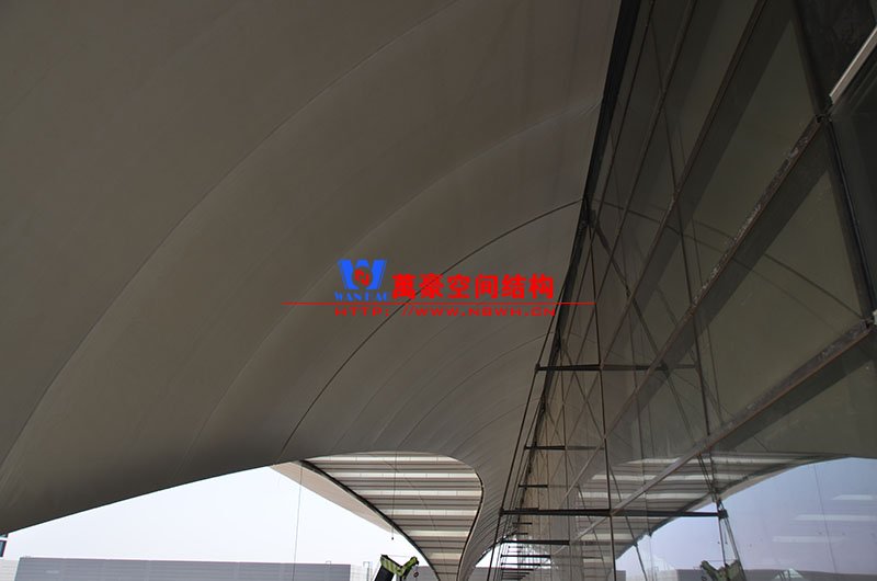 會展中心的入口大廳采用全透明幕墻,將南北向迥然不同的城市景觀聯(lián)系起來,輕質半透明屋頂覆蓋入口大廳的公共區(qū)域,輕盈的白色薄膜材質配以照明燈光,使整個大廳明亮而通透。該膜結構幕墻項目由寧波萬豪空間結構工程有限公司承建,項目完成的十分完美。