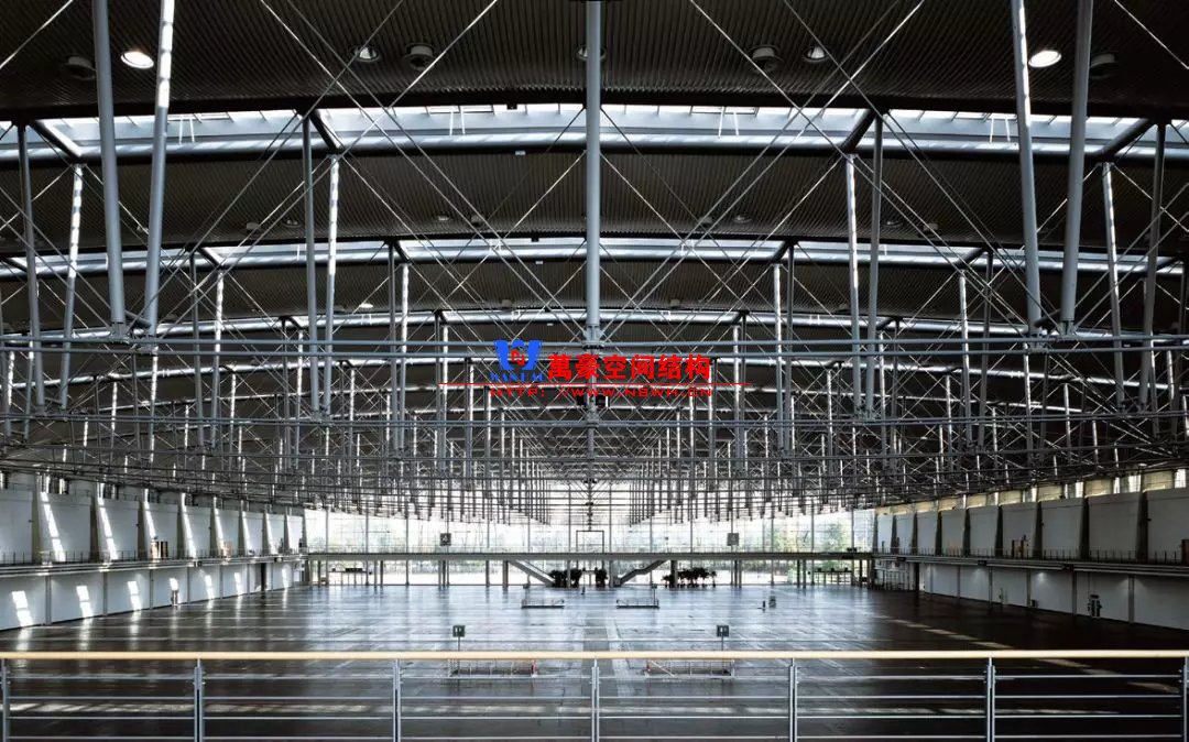 漢諾威會展中心是世界上最大、最負盛名的會展中心,超過50萬m2的凈展面積和每年超過50場的頂級展會,使其幾十年來穩(wěn)居行業(yè)龍頭地位。1994年,在漢諾威會展中心4號展廳的競賽中,德國gmp國際建筑設計有限公司(以下簡稱gmp)和sbp結(jié)構(gòu)工程師事務所(以下簡稱sbp)聯(lián)袂中標。展廳提供了一個通過玻璃采光頂自然采光的185.6m×116m的無柱大空間,凈展面積超過21 500㎡。雙層屋面結(jié)構(gòu)的下層以承重金屬波形板將屋頂下的設備管道保護起來,同時利用雙層金屬板結(jié)構(gòu)之間的空腔進行正壓送風,使得灰塵難以進入到空腔和管道。4號廳可以舉辦多種不同類型的活動,特別是容易產(chǎn)生灰塵的馬術等。