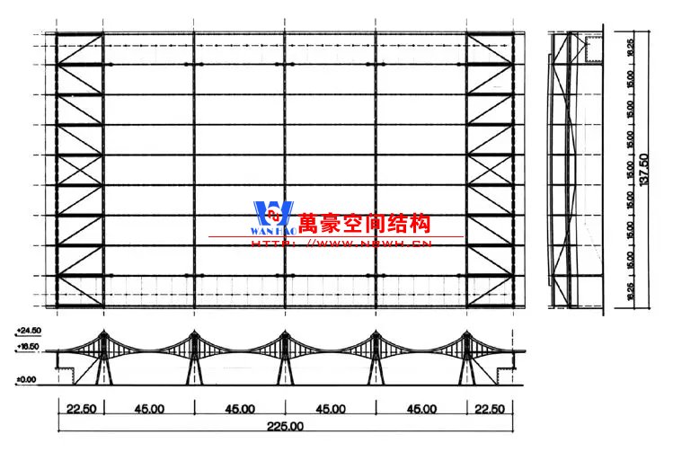 設計通過高40m、跨度95m的弧形膜結(jié)構(gòu)屋面和大面積玻璃幕墻突出了入口大廳的核心地位,并清晰高效地引導人流。十四個展廳分東西兩翼布局,西側(cè)布置了四個單層展廳,東側(cè)布置了五組兩層共十個展廳。這十四個展廳均采用了國內(nèi)會展公司常用的每個展廳10 000㎡的標準尺寸。展廳采用“方盒子”的設計理念和經(jīng)濟的結(jié)構(gòu)體系,用框架統(tǒng)一各展廳的語匯,并以清水混凝土呼應入口大廳。從漢諾威會展中心數(shù)個展廳設計的發(fā)展中可以清晰地看到,目前的展廳設計遵從功能和商業(yè)價值至上。因此,必須嚴格符合高效嚴謹?shù)恼刮荒?shù),符合最佳吊點位置和高要求的吊掛荷載。而在這樣的條件下,漢諾威8/9號展廳的結(jié)構(gòu)體系已經(jīng)不再適用。青島紅島會展中心的展廳正是基于這種高效布展的方式進行設計的:單層或雙層的展廳采用了典型的方盒子形式,下層布置重展,上層布置輕展。下層采用鋼筋混凝土結(jié)構(gòu),最大跨度為24m,梁高2.0m,樓面荷載1.5t。屋蓋體系采用最為經(jīng)濟的桁架結(jié)構(gòu),跨度63m,桁架高度4.7m,用鋼量僅為90kg/㎡。