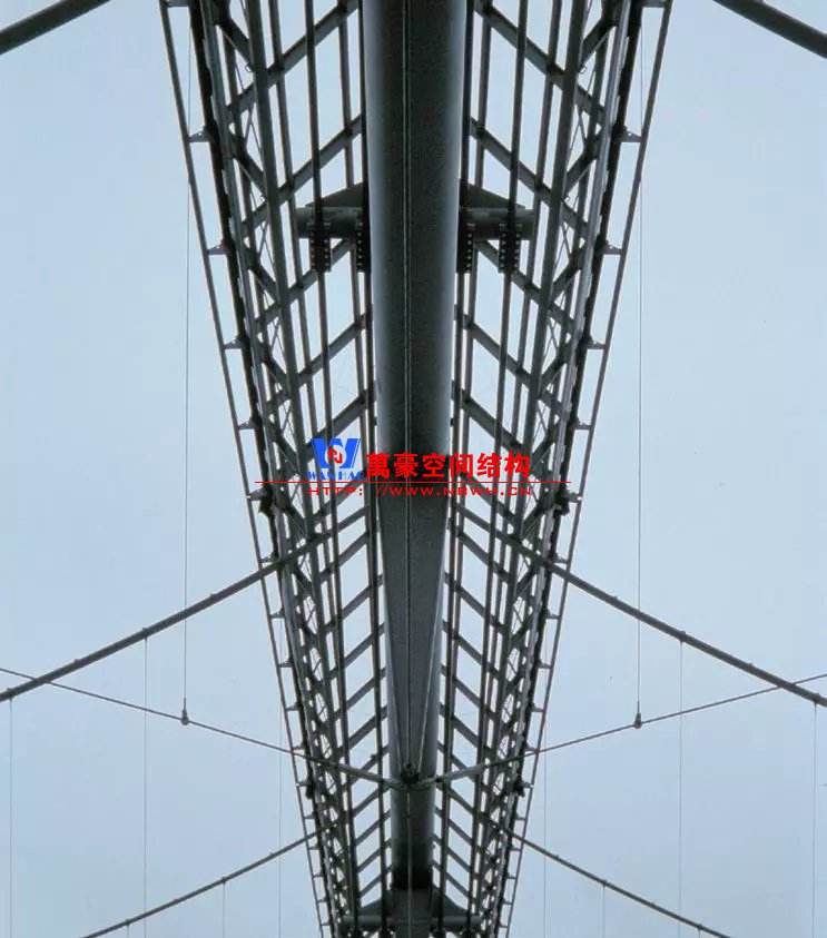 作為當時世界上最大的展廳,8/9號廳在設計和施工工藝上也幾乎達到了當時的技術極限。五榀138m長的類似自錨式懸索橋的主桁架是整個展廳的主脊,由主纜、背索、水平連接桿及吊索組成,并支承在兩端的A形柱上。主桁架之間設置了鋼板懸?guī)菝?,和傳統(tǒng)的懸?guī)菝娌煌?,為了避免加大主桁架的負擔,結(jié)構(gòu)工程師沒有采用加重屋面板的傳統(tǒng)做法,而是在屋面下方加設穩(wěn)定索,形成豎向剛度較高的索桁架來抵抗風荷載產(chǎn)生的上吸力和不均勻力。設計中充分利用懸掛體系,設置了包括兩個懸挑跨在內(nèi)的六跨結(jié)構(gòu)體系,在邊跨設置水平轉(zhuǎn)換桁架和斜拉索用于錨固。