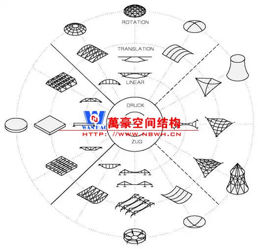 網(wǎng)殼結(jié)構(gòu)的定義有三個(gè)關(guān)鍵詞:“曲面”、“桿件”、“薄膜作用”。我們從而可以找到網(wǎng)殼結(jié)構(gòu)在結(jié)構(gòu)體系中的位置。