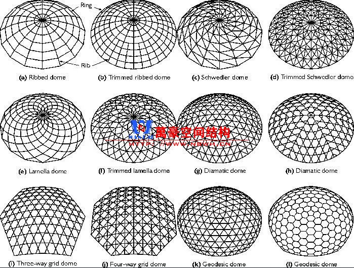 ▲網(wǎng)殼的各種網(wǎng)格形式