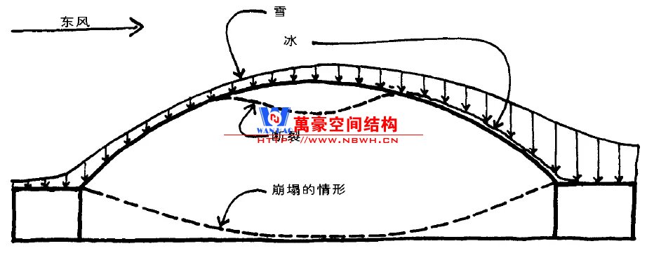 當(dāng)晚,大雪在風(fēng)力作用下在穹頂上產(chǎn)生了飄移,雪堆積在背風(fēng)面造成了不均勻荷載。雖然總體雪荷載只有設(shè)計(jì)總荷載的1/4,但卻集中在屋頂表面的1/3區(qū)段,不均勻荷載分布造成了倒塌。