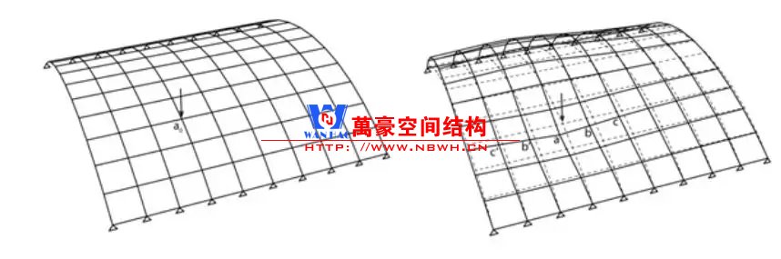 網(wǎng)殼受力方式為薄膜作用,屬于拱結(jié)構(gòu)向三維的拓展;因此,與拱類似的問題會(huì)出現(xiàn)在網(wǎng)殼上。比如:整體穩(wěn)定問題;不對(duì)稱荷載敏感等。