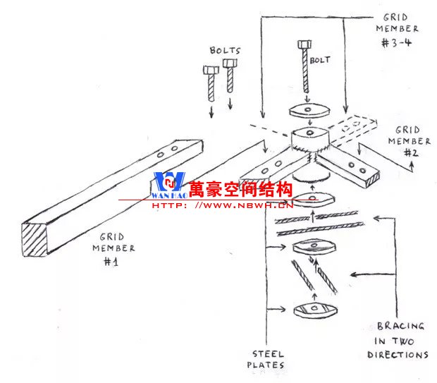 為了運(yùn)輸和安裝的方便,所有的桿件被設(shè)計(jì)成了1m的標(biāo)準(zhǔn)長(zhǎng)度,在節(jié)點(diǎn)處由螺栓連接。