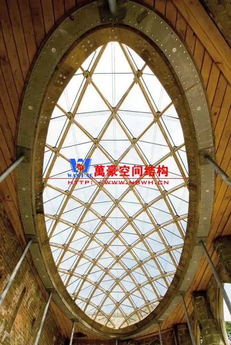 這是一個(gè)古老的鑄鐵網(wǎng)殼,建于19世紀(jì)后期。可以看出,這個(gè)網(wǎng)殼沒有斜桿,它是利用桿件的抗彎能力來(lái)抵抗平面的扭轉(zhuǎn)。