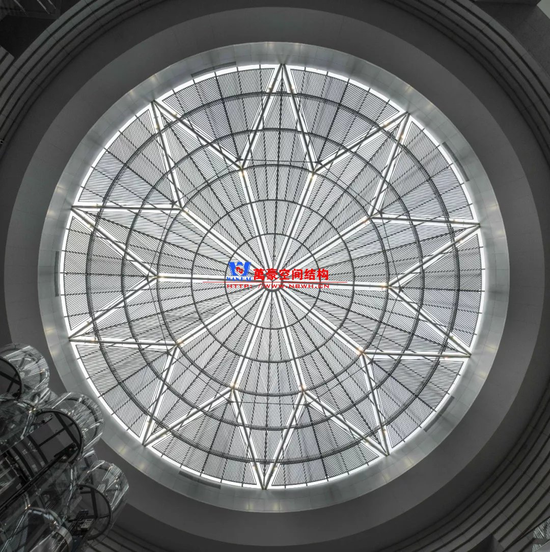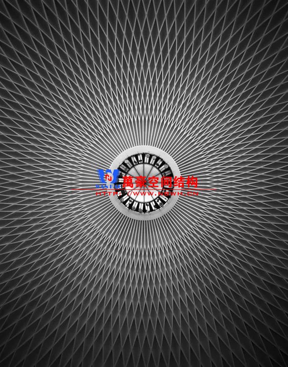 天窗位于交通中心地下一層圓形中庭上空,人流在這里交匯,在選擇結(jié)構(gòu)網(wǎng)格布置時(shí)需要考慮其向心匯聚效應(yīng),因此方向性較弱的施威德勒網(wǎng)格和凱威特網(wǎng)格就不適合。