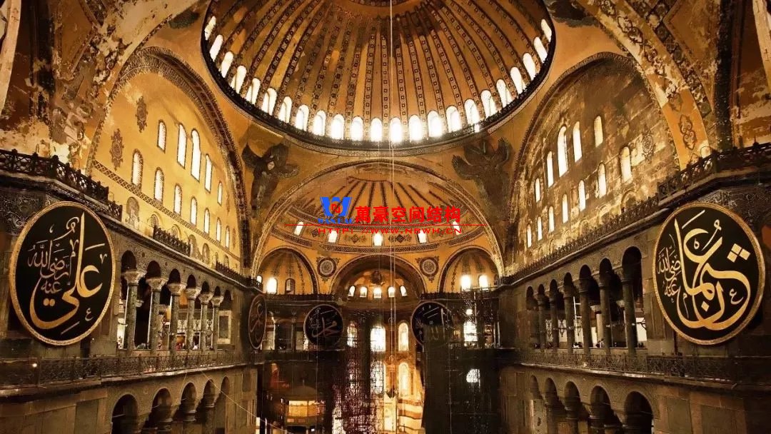 一千五百年前的圣索菲亞大教堂也因其巨大的穹頂而聞名于世。穹頂直徑31.24米。這座著名的穹頂也算是命運(yùn)多舛,自建成之后由于穹頂自身巨大的側(cè)推力曾先后倒塌三次。工程師也曾試圖通過增加墻厚、增設(shè)飛扶壁、增加穹頂矢高等方法加固,但依然沒有結(jié)束它不斷倒塌的命運(yùn)。