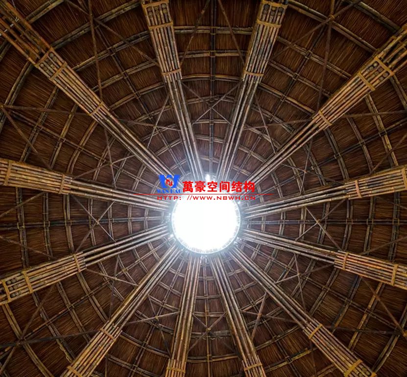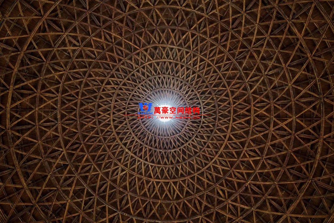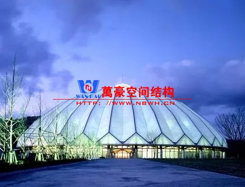 出云穹頂,球形穹頂直徑143.8米,拱頂部高度48.9m米。它最大的結(jié)構(gòu)特點(diǎn)是綜合性。材料上有鋼、木、薄膜;結(jié)構(gòu)形式上有拱、桁架、索膜結(jié)構(gòu),并充分發(fā)揮了每個(gè)部份的優(yōu)勢(shì)。