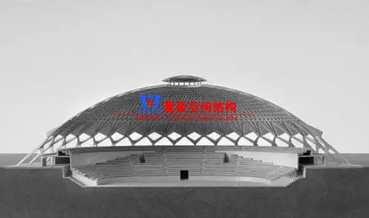 羅馬小體育館(Palazzetto DelloSport)不僅由奈爾維設(shè)計(jì),而且由其建筑公司(Nervi and Bartoli Engineers公司)建造。組成薄殼穹頂?shù)?620塊用鋼絲網(wǎng)水泥預(yù)制的菱形槽板,在地面模板上澆注成形。板間的鋼筋混凝土肋和節(jié)點(diǎn)現(xiàn)澆,之后在上面再整澆一層混凝土,形成整體并兼作防水層。由于采用了奈爾維體系(Nervi system)”工法,建造成本大幅降低,而工期僅用了7個(gè)月時(shí)間。預(yù)制的菱形板和現(xiàn)澆的肋線,形成優(yōu)美的天花,堪稱建筑、結(jié)構(gòu)、施工完美呈現(xiàn)的藝術(shù)品。