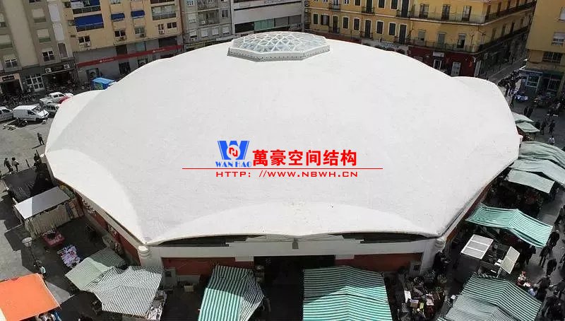 再比如托羅哈1933年在瑞士設(shè)計(jì)的阿赫西拉斯鎮(zhèn)集市屋面。正八角形穹頂直徑達(dá)47.6m,曲率半徑為44.2m。作為單一的球殼,它的跨度第一次超越了萬神廟穹頂。殼體厚度最小為8.9cm,厚跨比是1/535;支承點(diǎn)附近加厚至45.7cm。