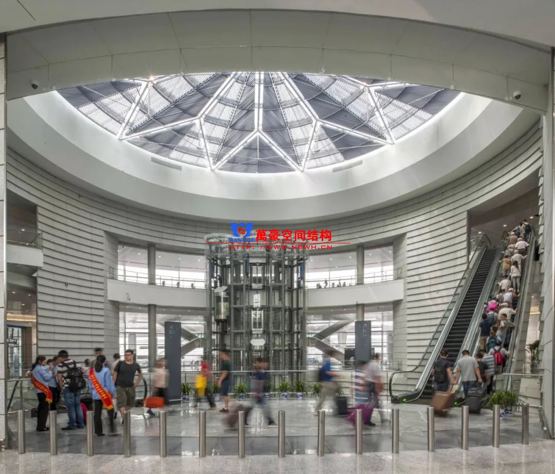 這是某機(jī)場(chǎng)交通中心中庭的一個(gè)圓形天窗,天窗直徑30米。如果讓我們隨便設(shè)計(jì),有哪些方法可以填滿這個(gè)圈呢,我們來看下。