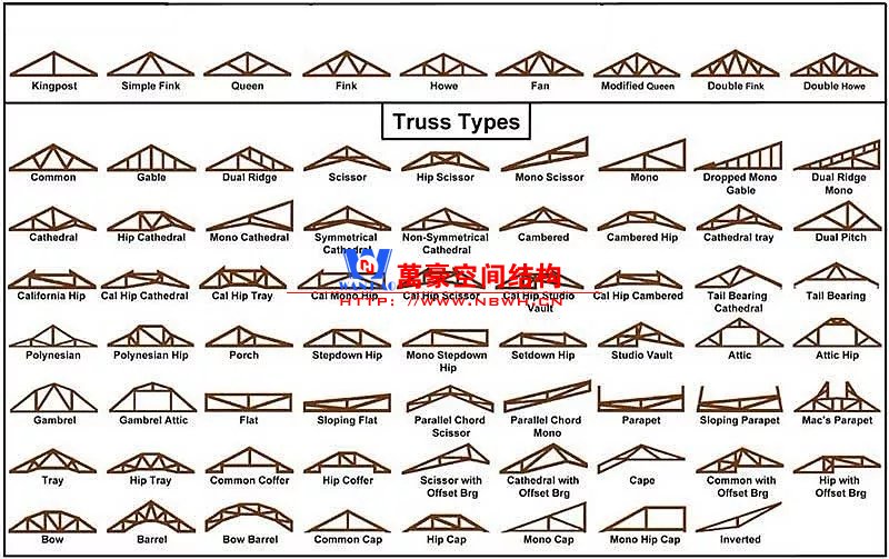 單柱式和雙柱式屋架在相當(dāng)漫長(zhǎng)的歷史中并沒(méi)有太大變化。直到19世紀(jì)中葉,各種現(xiàn)代桁架形式相繼出現(xiàn),比如豪威桁架(Howe)、芬克桁架(Fink)、華倫桁架(Warren)、普拉特桁架(Pratt)等。桁架材料也不再局限于木材,越來(lái)越多的采用了鐵或鋼。