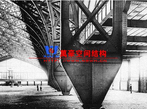 巴黎世博會(huì)機(jī)械館由工程師J·B.Krantz和埃菲爾Eifel設(shè)計(jì),于1867年建成。它采用鋼制三鉸拱,拱截面為桁架格構(gòu)形式。共有20榀這樣的鋼拱,形成寬115米、長(zhǎng)420米,內(nèi)部毫無(wú)阻擋的龐大室內(nèi)空間。