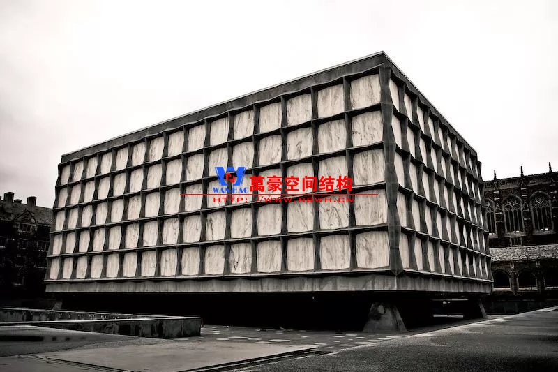 耶魯大學(xué)善本圖書(shū)館采用了多層空腹桁架。建筑上部五層整體構(gòu)成空腹桁架由四角的柱墩支承,建筑首層全部架空。