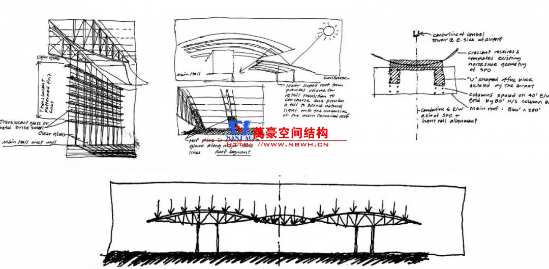 關(guān)西機(jī)場(chǎng)建筑設(shè)計(jì)概念上追求連續(xù)的空間感受。建筑建筑上呈現(xiàn)流動(dòng)的形態(tài)。結(jié)構(gòu)上采用了82.8米超大跨度的空間桁架。