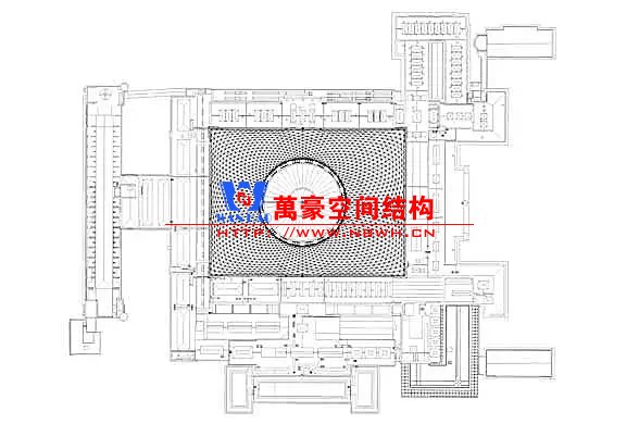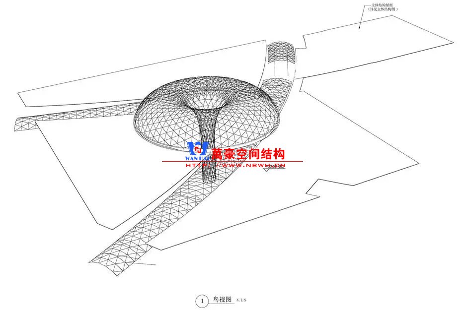 沿中心圓徑向布置主受力網(wǎng)格,再輔助另兩個方向的圓弧線條劃分出1656個三角形平面玻璃板。