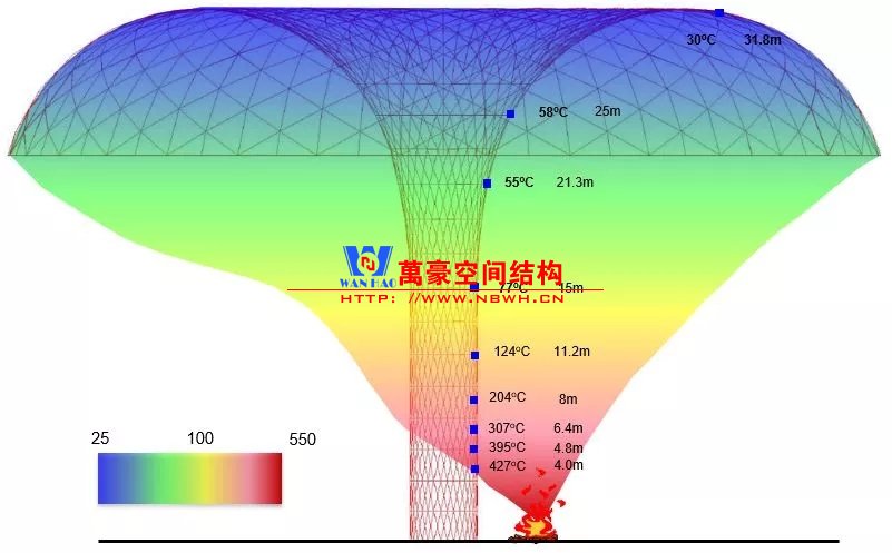 根據(jù)消防規(guī)范,中庭鋼結(jié)構(gòu)要涂防火涂層以提供1.5~3小時的耐火保護(hù)。通過性能化分析,設(shè)計師提出創(chuàng)新的水簾保護(hù)系統(tǒng)作為鋼材防火替代方案。水簾經(jīng)由氣化,可以吸收火與煙霧大部分熱量,使鋼材表面溫度顯著降低。