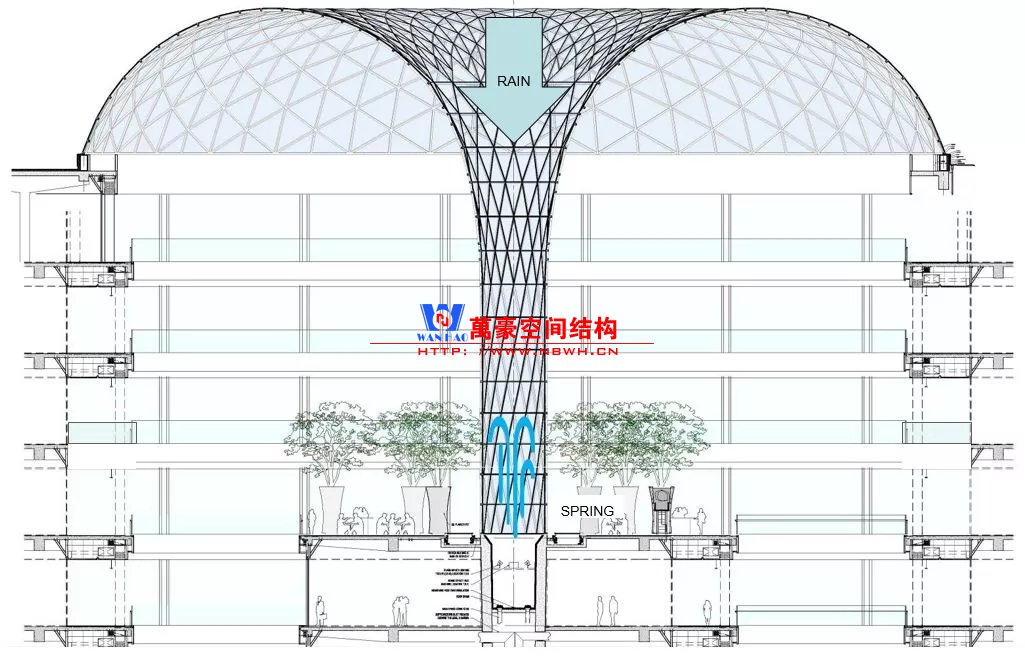 巨大透明天幕能增強(qiáng)自然采光和視覺通透性,然而另一方面,也帶來眩光和太陽熱輻射增加等潛在問題。因此,設(shè)計師采用低輻射鍍膜玻璃、通風(fēng)裝置和氣簾、雨水收集系統(tǒng)等兼顧了訪客的最佳舒適度和綠色生態(tài)品質(zhì)。