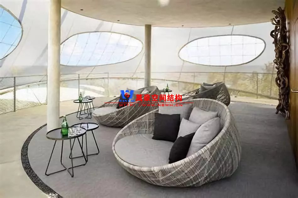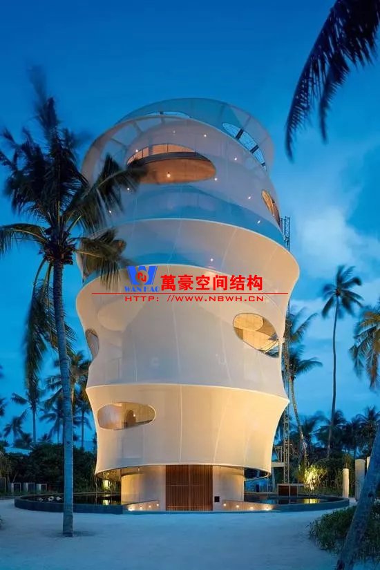 與島上其他傳統(tǒng)的“塔瓦魯”風(fēng)格建筑不同,由于其高度為23米,并且采用特殊結(jié)構(gòu),目前的結(jié)構(gòu)在島上占主導(dǎo)地位。建筑物的正面使用了鋼筋混凝土整體結(jié)構(gòu),而不是傳統(tǒng)的天然材料。它用作支撐管,由各個(gè)預(yù)制臺(tái)階制成的控制臺(tái)樓梯圍繞該支撐管旋轉(zhuǎn)。外圍的所有元素都被遮蓋在淺灰色半透明的法拉利381網(wǎng)孔膜中,遮陽(yáng)隔熱,又不影響視覺(jué)通透性。