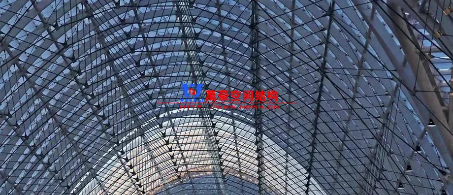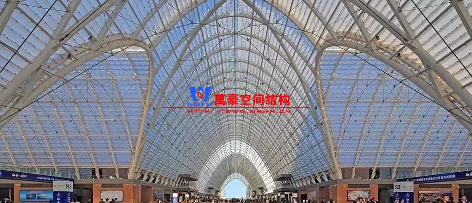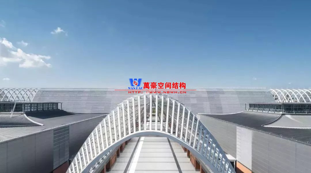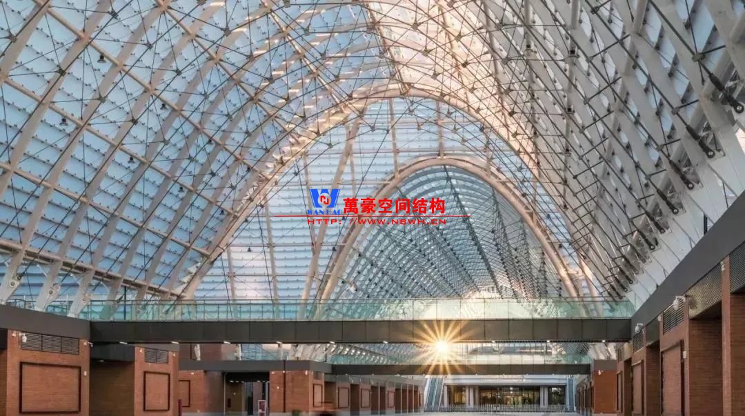 建筑內(nèi)在的空間結(jié)構(gòu)形成了外部形態(tài)的美學(xué)韻律和視覺(jué)沖擊力,使建筑形象真實(shí)而動(dòng)人。包括展廊與展廳兩部分,以中央十字展廊為功能組織核心,南北各布置6個(gè)、共12個(gè)獨(dú)立展廳單元(尺寸74.4m×136.4m,采用變標(biāo)高的空間桁架鋼結(jié)構(gòu))。展廊平面呈十字型布置,東西向長(zhǎng)507m,南北向長(zhǎng)287m,主拱和次拱方向分別設(shè)置兩道溫度縫,最高點(diǎn)標(biāo)高為35.0m。