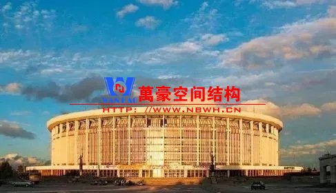 結構體系為輪輻式雙層懸索體系。外環(huán)直徑93m,內環(huán)直徑12m。輻射狀布置48組索桁架,索桁架高跨比1/17,承重索直徑63mm,穩(wěn)定索直徑42.5mm。鋼筋混凝土外環(huán)截面2.8m*0.62m,屋面為4mm厚有肋薄鋼板。沿環(huán)向與豎向腹桿對應處,布置了兩圈豎向鋼板支撐體系,提高了結構整體性能,減低了自身高度。屋蓋用鋼量99.3kg/m2。