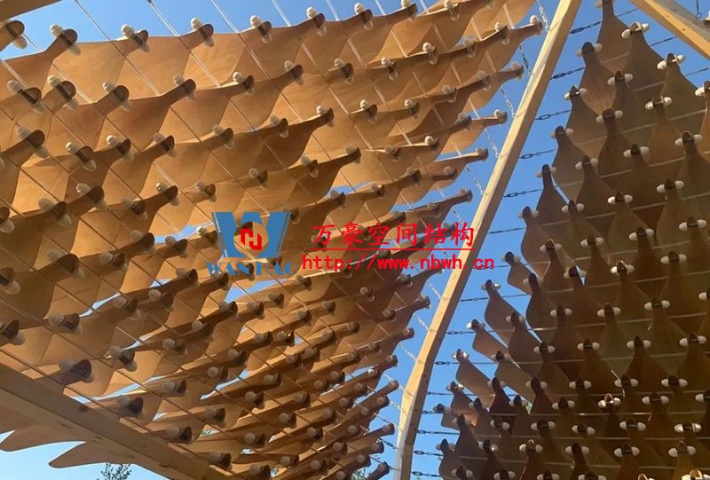 該項目采用簡單的木質結構,支撐在多排張緊的鋼絲上,用于固定配重的瓦片。瓦片是用經(jīng)過折疊和切割的、浸泡在保護油中的飛機蒙皮板建造的。配重是用不銹鋼螺母和螺栓構成的。保護油是由Virtasen Maalitehdas捐贈的。