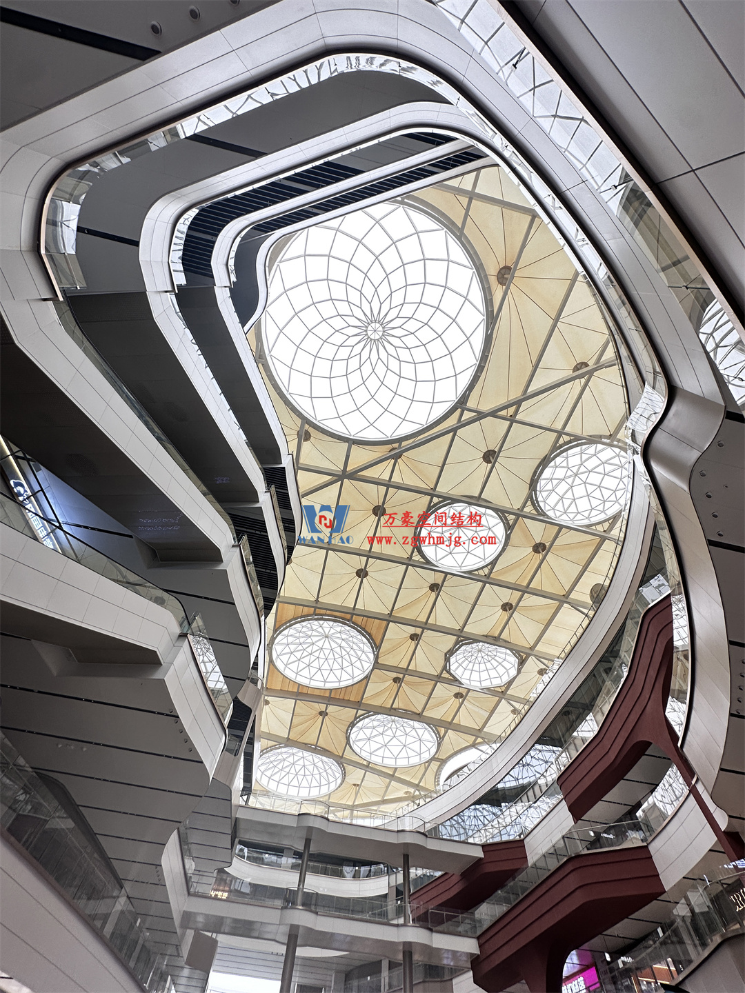 當(dāng)我們漫步在大型商業(yè)街區(qū),會(huì)發(fā)現(xiàn)越來越多的廊道或大廳頂部采用了半透明或透明的建筑材料,這些大多是膜結(jié)構(gòu)的杰作。曾經(jīng),為了滿足商場(chǎng)自然采光的需求,陽光板和鋼化玻璃是常用的選擇,它們能讓商場(chǎng)在白天更敞亮,還節(jié)省了照明設(shè)施的運(yùn)行時(shí)間和能耗。然而,這些傳統(tǒng)材料也有著明顯的缺點(diǎn),陽光板在陽光直射下老化速度極快,鋼化玻璃自重大,對(duì)支撐結(jié)構(gòu)要求高,安全性也是一大難題。而膜結(jié)構(gòu)的出現(xiàn),完美地解決了這些問題。PTFE 和 ETFE 膜材料不僅能夠?qū)崿F(xiàn)良好的透光性,而且重量輕,安全性更高。特別是 ETFE,它具有高自潔性和高透光性的特點(diǎn),成為了大型商業(yè)街區(qū)穹頂?shù)氖走x材料。而PTFE與ETFE兩者結(jié)合互補(bǔ),也是非常好的選擇。