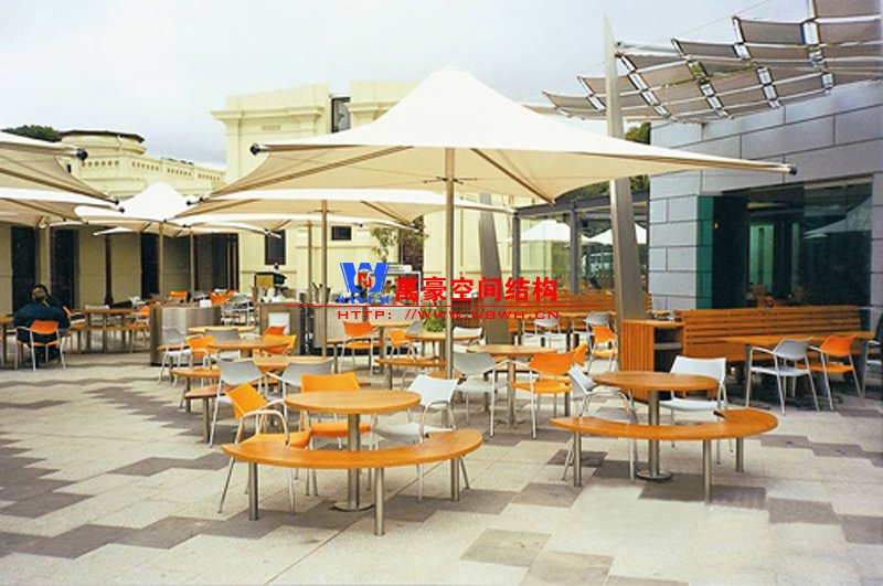 商業(yè)街在城市中占有相當(dāng)大的比重。商業(yè)街的建筑與環(huán)境是城市文明的窗口,代表著物質(zhì)文明和精神文明的水平,同時,也是景觀環(huán)境的重要組成部分。商業(yè)街膜結(jié)構(gòu)輕巧別致極具現(xiàn)代化風(fēng)格,且表現(xiàn)形式多樣易于安裝移動,在商業(yè)街設(shè)計中得以廣泛應(yīng)用。