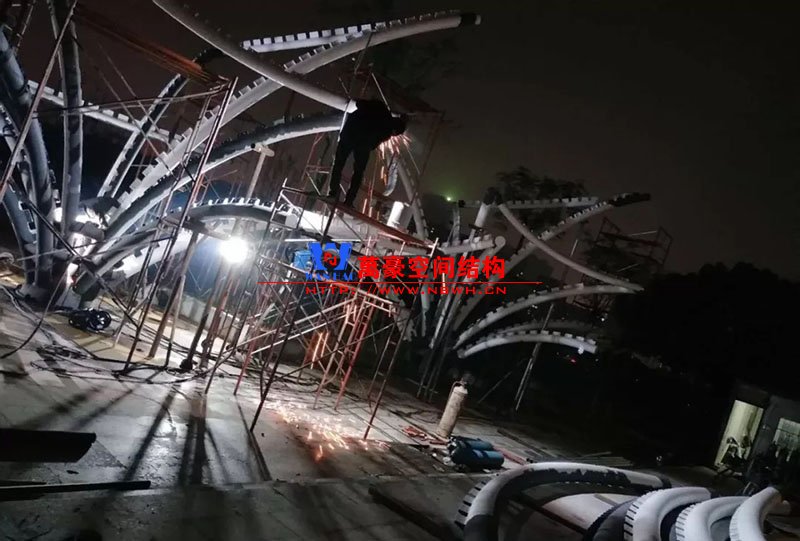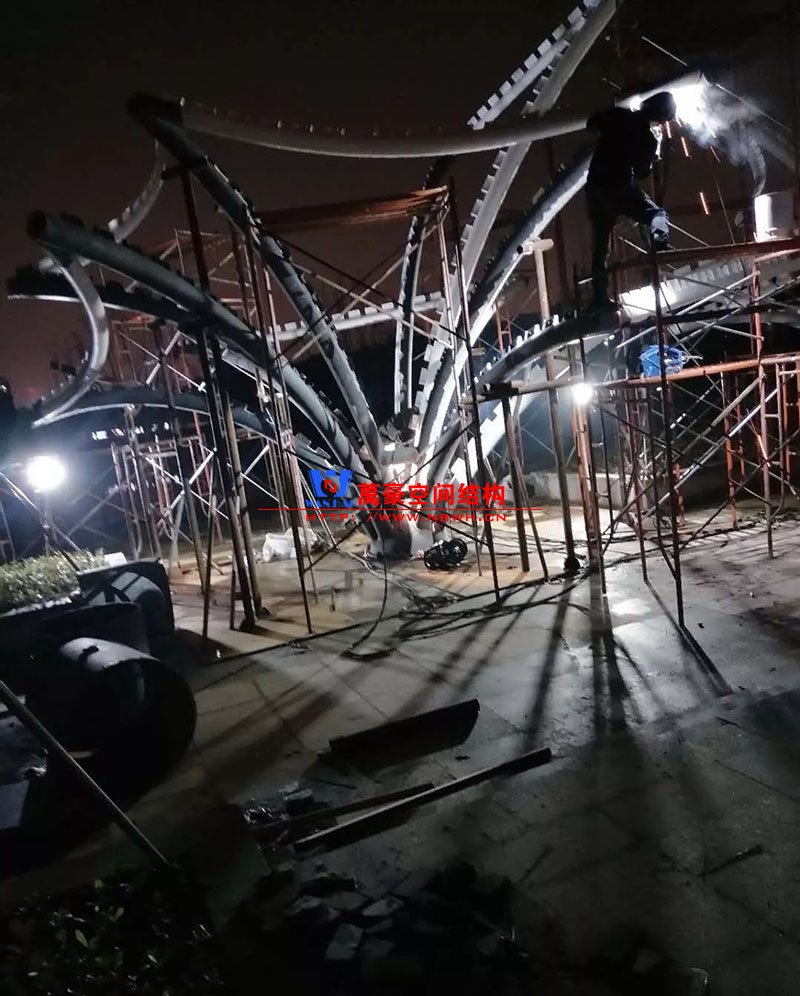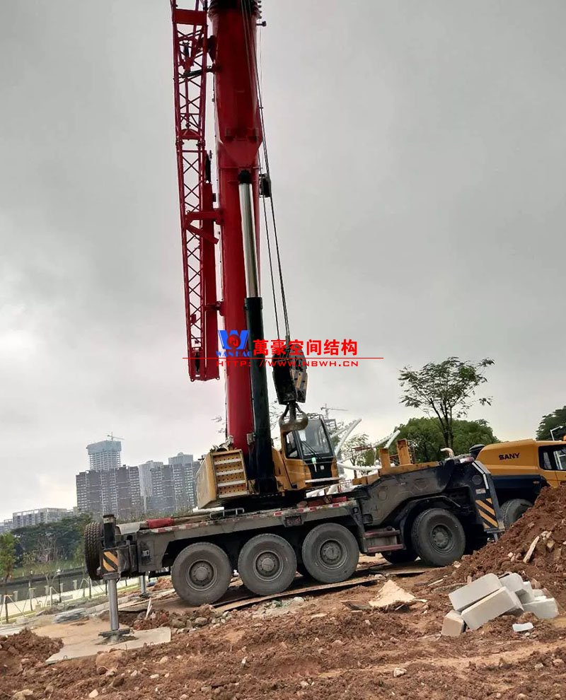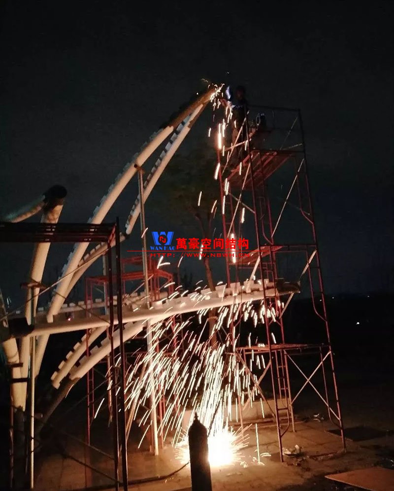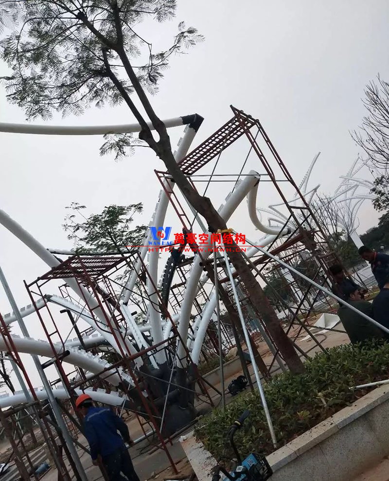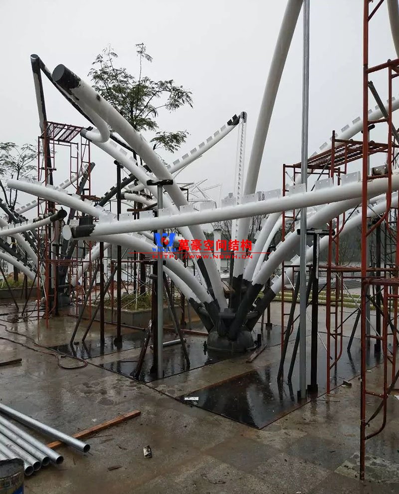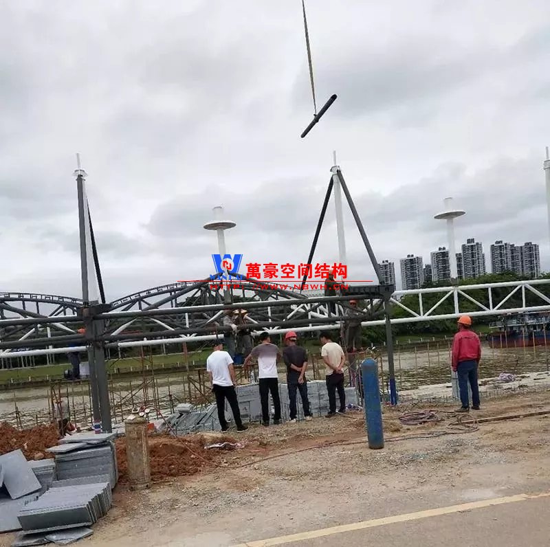 鋼構(gòu)安裝初步完成,效果初現(xiàn),膜結(jié)構(gòu)開始安裝。