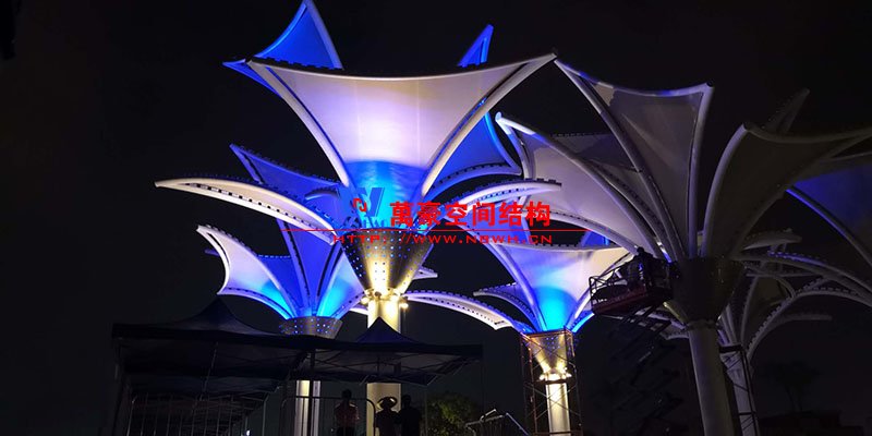 其中主席臺龍舟拉膜項目高度為7.25米,膜結(jié)構(gòu)屋面材質(zhì)為PTFE膜材。廣場鋼拉膜項目由六個龍船花造形景觀組成,每個龍船花景觀造形立柱的高度不得低于3.80米,花瓣造形最低高度 7.54米,花瓣造形最高高度9.608米,膜結(jié)構(gòu)屋面材質(zhì)為 PTFE網(wǎng)格基布雙面貼透明ETFE建筑膜。