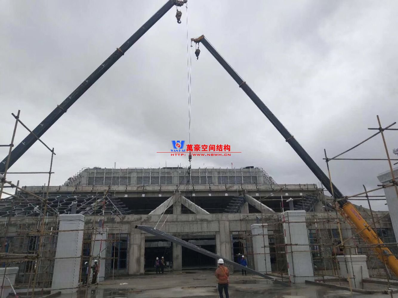目前,主樓六邊形、二樓斜屋面每面四根大梁已全部安裝完畢,現(xiàn)在一個面的其他鋼構正在安裝中,穹頂大梁框架完成。
