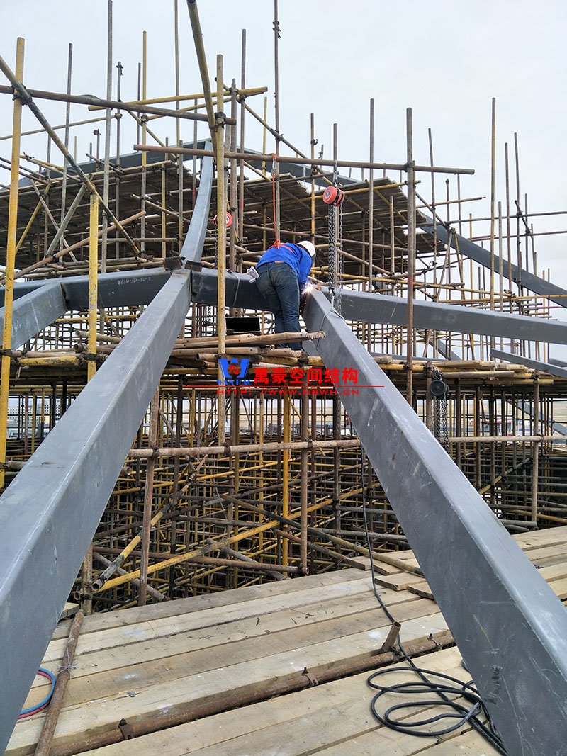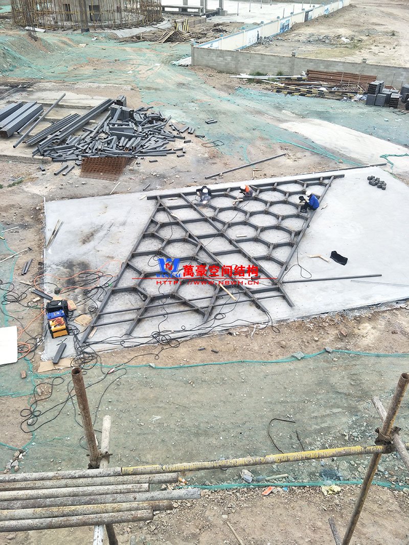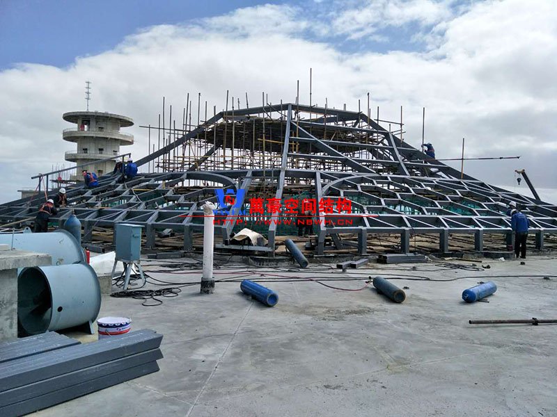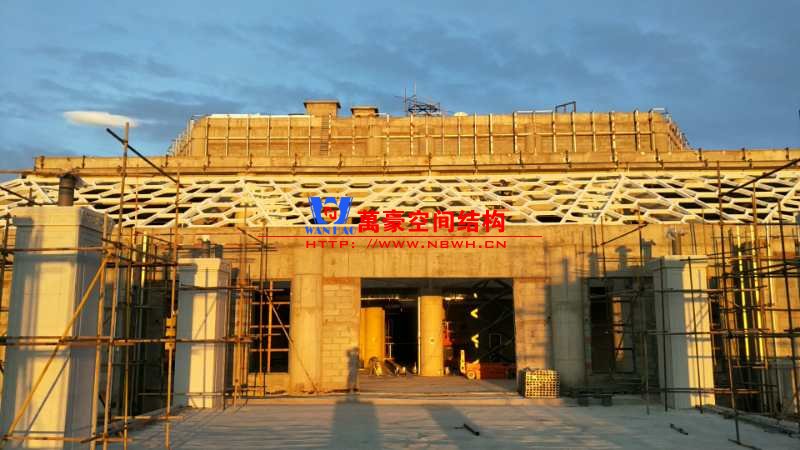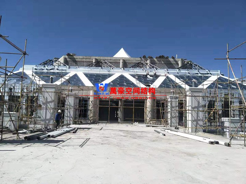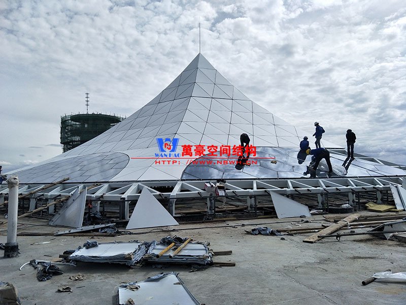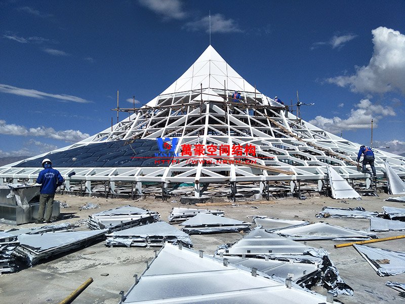 該項(xiàng)目分小蠻腰觀光塔和六角主樓兩部分,其中小蠻腰觀光塔由雙曲面空間鋼結(jié)構(gòu)相互交叉形成幾何形的外掛玻璃組成,主樓由雙曲面穹頂及6條連廊組成。鋼結(jié)構(gòu)跨度35米,鋼膜總面積28000平米,鋼結(jié)構(gòu)用鋼量1100噸。建筑內(nèi)部空間明亮通透,遠(yuǎn)觀猶如大漠孤煙中的鹽湖之晶,近觀仿佛置身于鹽湖中的浪漫滿屋。
