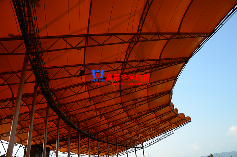 夢幻谷“暴雨山洪”看臺為骨架支承式膜結構。骨架鋼結構由15榀主桁架和154根弧管組成,采用圓鋼管制作。