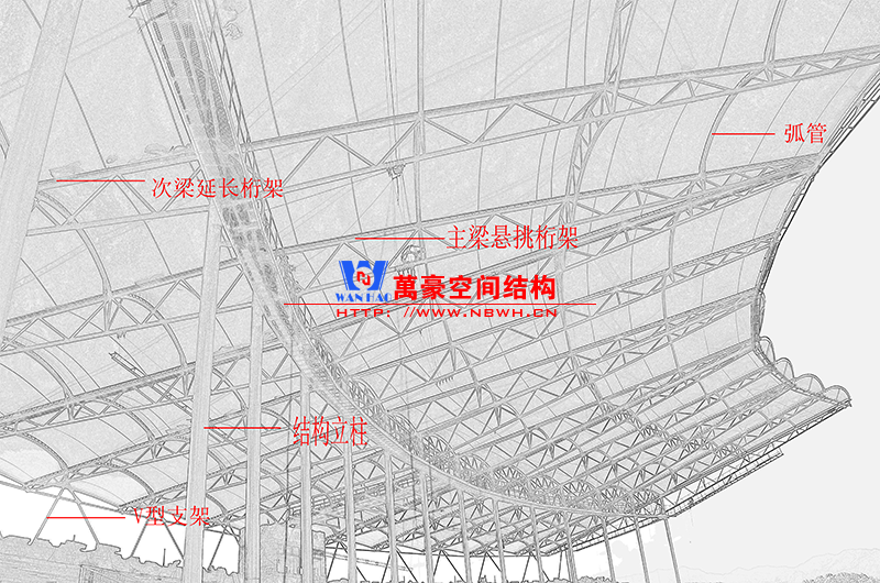 主桁架之間用弧管連接,弧管起著調(diào)整各主桁架間的內(nèi)力分配,同時作為主桁架的側向支撐,傳遞側向水平荷載、提高整體結構的穩(wěn)定性?;」艹适父?m~1.5m的拱形,能更好的支撐膜面,使之更具備自排雨、雪的功能。