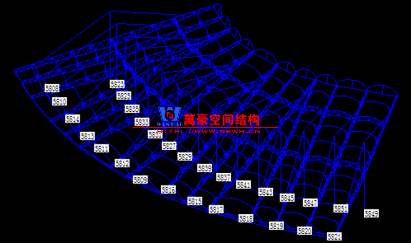 該工程膜結構及相應的支承結構,均是以內(nèi)部主體結構為承載體,通過膜體及相關的結構支承。選用3S3D11.0設計軟件進行分析,計算簡圖見圖II-19-8??紤]恒荷載0.01KN/ m2,風荷載0.55KN/m2 ,雪荷載0.35KN/m2 ,活荷載0.3KN/m2。