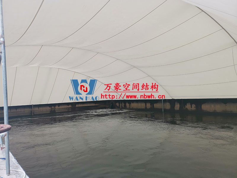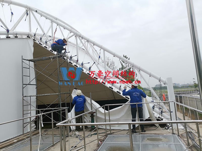 淮安鹽化新材料產(chǎn)業(yè)園區(qū)污水處理廠膜結(jié)構項目位于江蘇省淮安市,由寧波萬豪空間結(jié)構工程有限公司承建。該項目采用碳鋼骨架(外側(cè))+聚酯纖維(反吊)結(jié)構形式,造型美觀,經(jīng)濟適用。