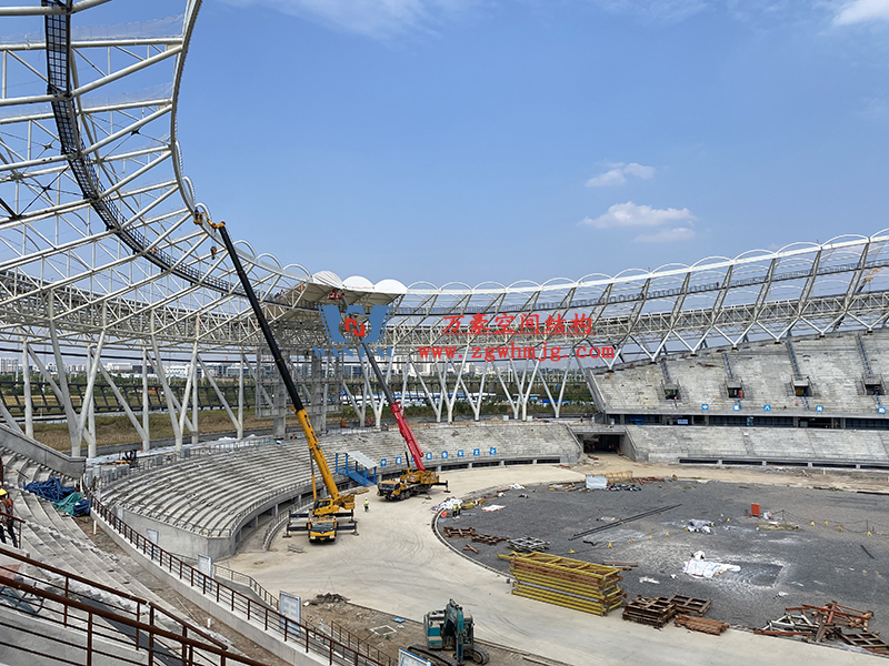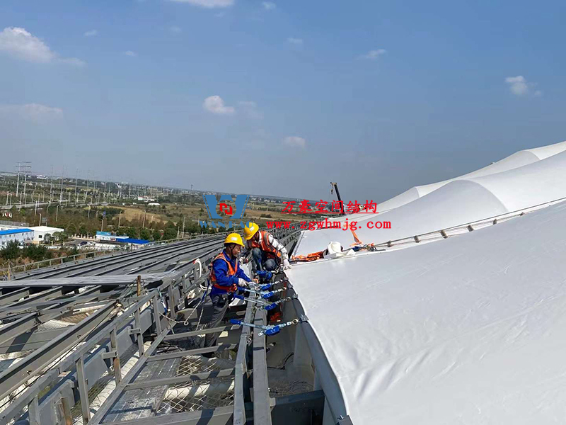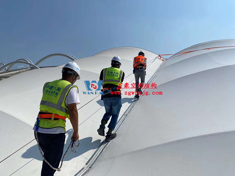 襄陽奧體中心PTFE膜結(jié)構(gòu)屋面歷經(jīng)幾個(gè)月的緊張工作,已經(jīng)全面投入高峰期作業(yè)。在最高溫的天氣夾雜著汗水和最熱情的狀態(tài)譜寫著萬豪空間結(jié)構(gòu)的故事,所謂藝高人膽大高瞻遠(yuǎn)矚,現(xiàn)場的每一個(gè)人通過自己最樸實(shí)的勞動(dòng)方式贏得各方尊重。