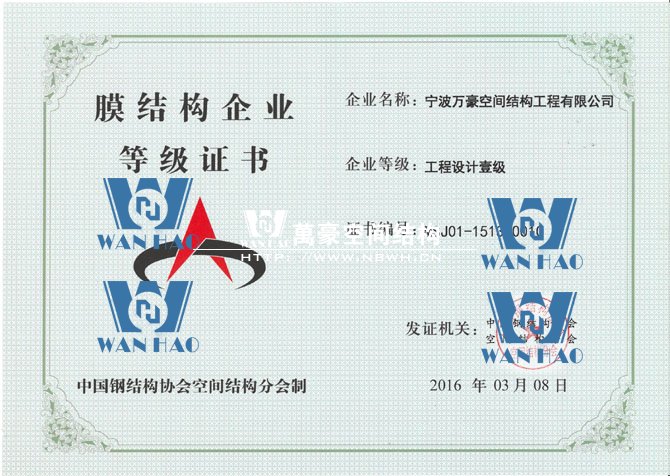 憑借著公司的硬實力,寧波萬豪空間結(jié)構(gòu)工程有限公司在膜結(jié)構(gòu)企業(yè)等級會員第十六次評審中榮獲工程承包、專項設(shè)計雙一級資質(zhì)。標志著公司向前更進一步,也是協(xié)會對公司實力的認可,公司將不斷努力,為膜結(jié)構(gòu)行業(yè)的發(fā)展貢獻自己的力量。