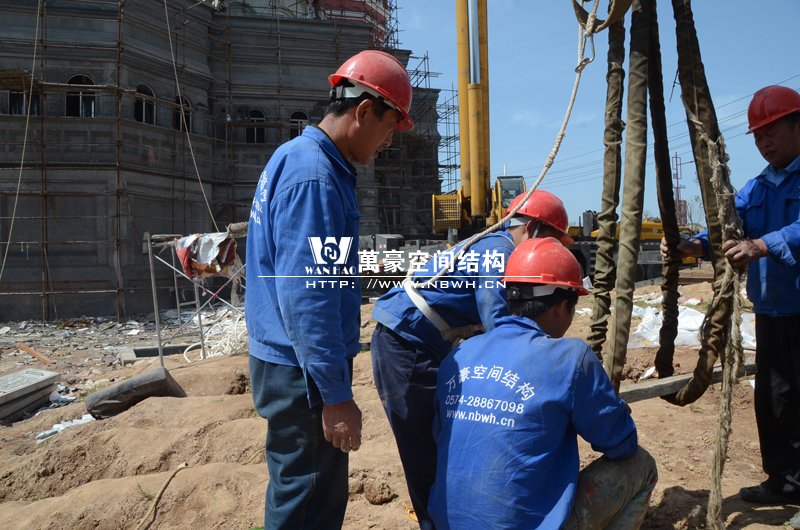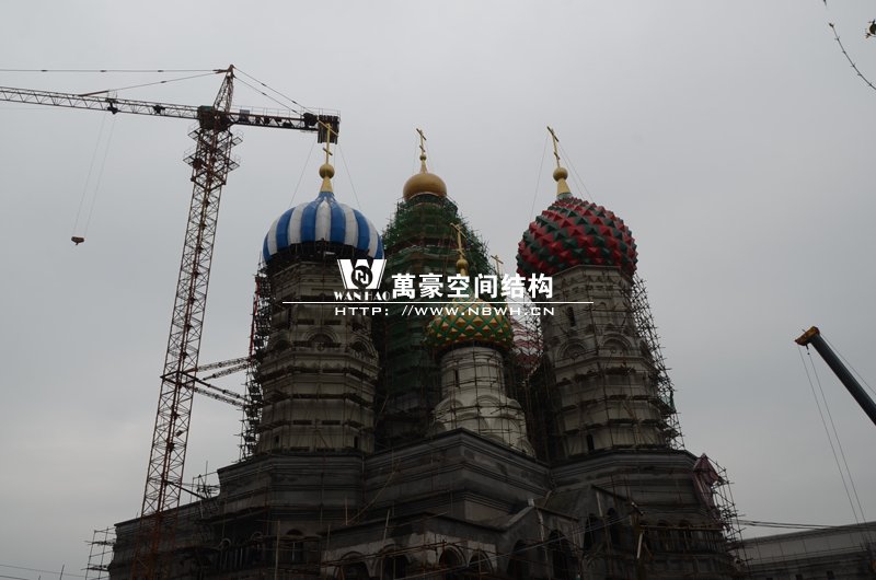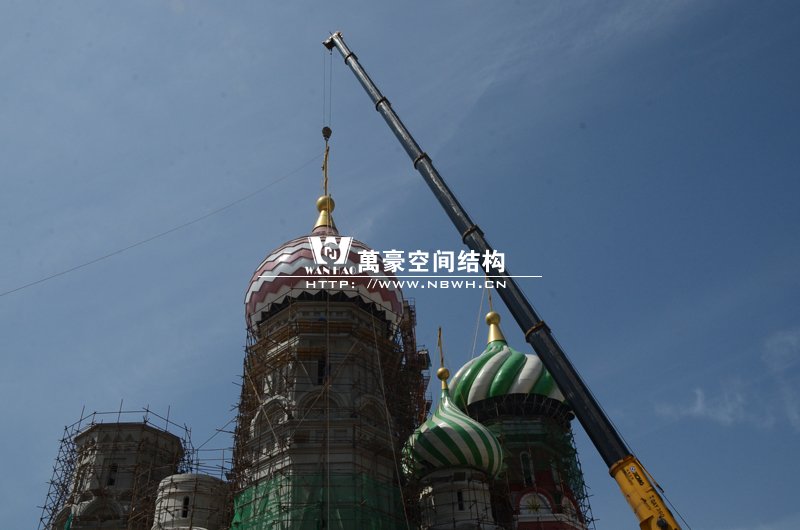 橫店圓明新園俄羅斯館屋頂整體吊裝順利完成,300多噸的大吊車(chē),20多噸重的鋼結(jié)構(gòu)裝飾球,80米高的作業(yè)平臺(tái),在萬(wàn)豪現(xiàn)場(chǎng)管理人員和工人的緊密協(xié)調(diào)下,經(jīng)過(guò)一周的晝夜努力終于大功告成,本次吊裝從4月17日開(kāi)始,前期天氣晴朗無(wú)風(fēng),是吊裝的好天氣,吊裝也是順利進(jìn)行,之后的幾天陰雨不斷,大家為了吊裝盡快順利完成,在雨小的時(shí)候冒雨進(jìn)行吊裝,終于在4月22日吊裝正式完成。