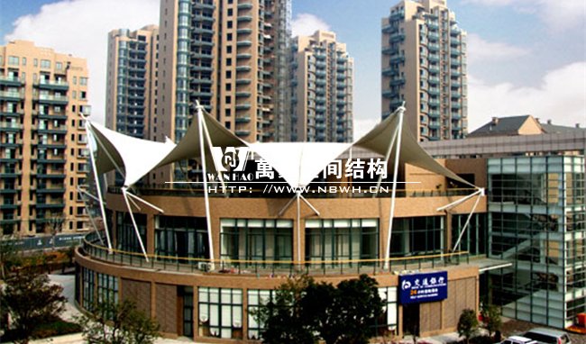 工程屹立在寧波鄞州區(qū)紫郡小區(qū),作為小區(qū)售樓處屋頂景觀,整體工程有8片單體膜組成,每片單體膜展開(kāi)面積約50平方米,結(jié)構(gòu)造型飄逸輕盈,結(jié)構(gòu)受力有墻體承載,為張拉式膜建筑的典型代表,膜材高低起伏,形如波濤拍岸。極具現(xiàn)代化氣息,和諧的融與環(huán)境,成為商業(yè)小區(qū)的一道亮麗風(fēng)景線。