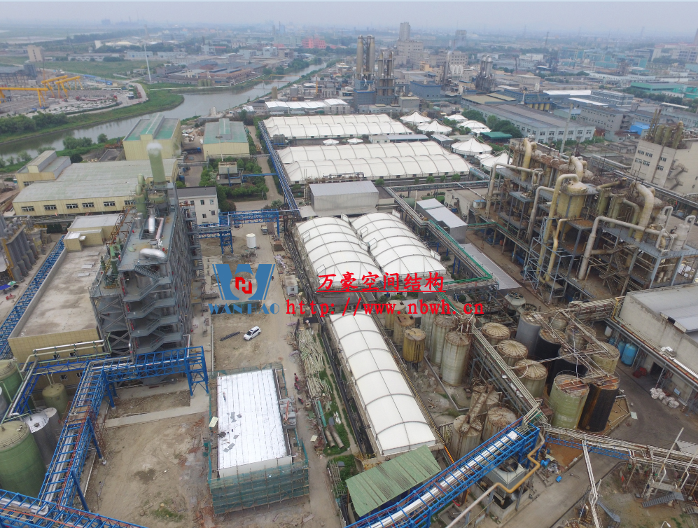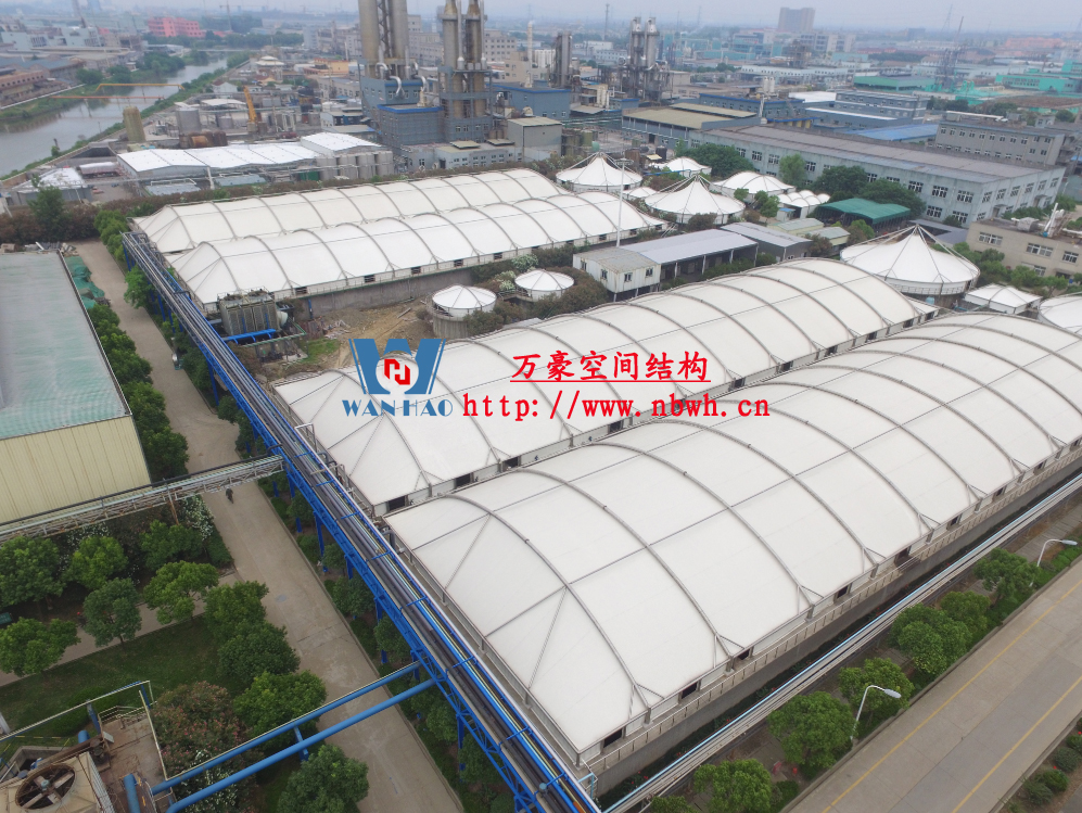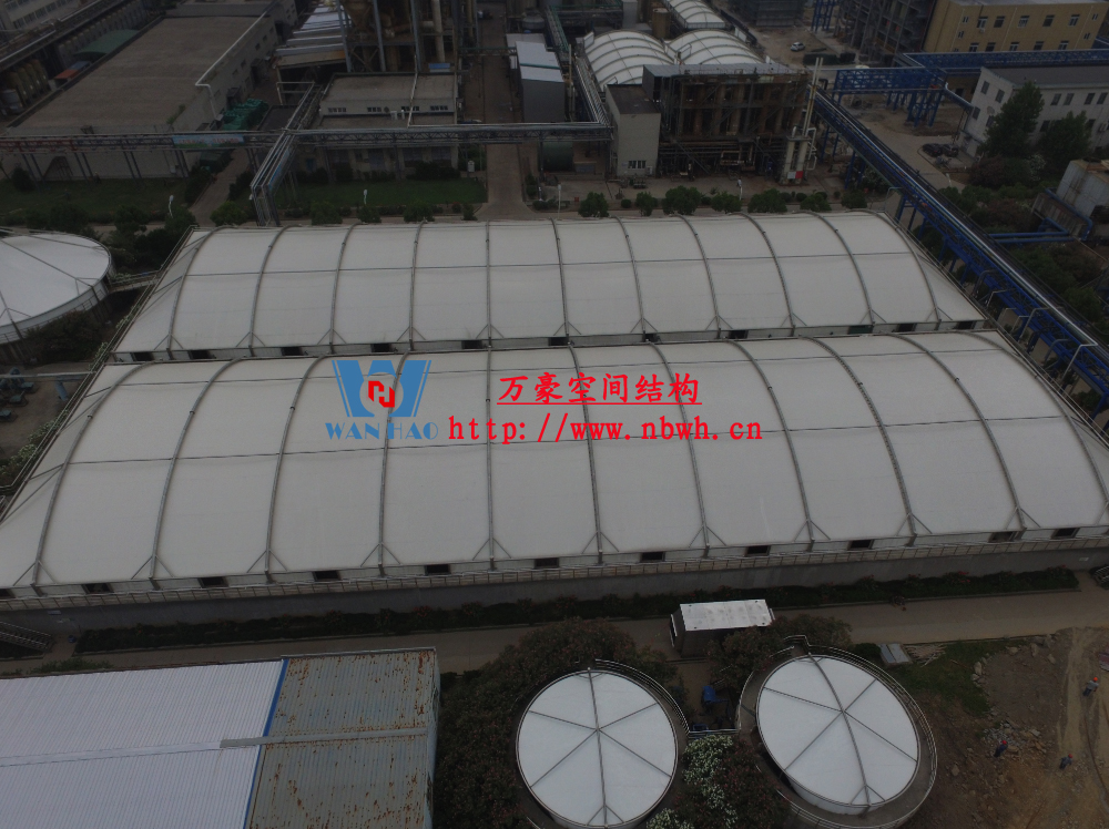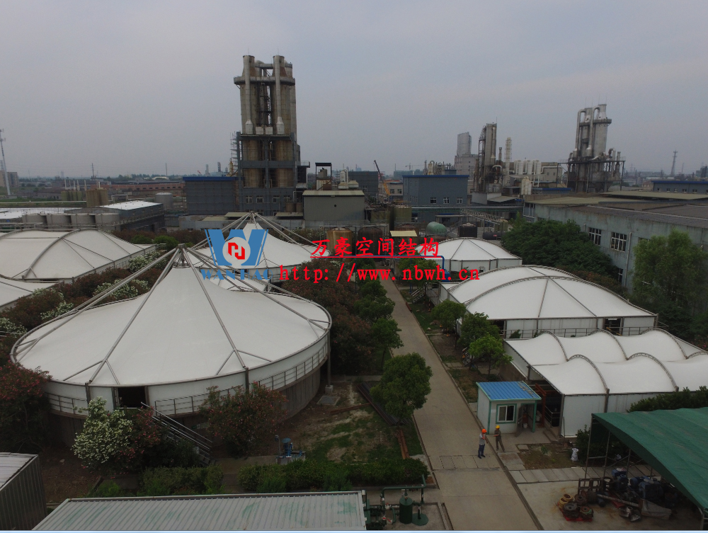 東廠區(qū)生化池膜結(jié)構(gòu)加蓋工程,坐落于浙江省紹興市杭州灣上虞經(jīng)濟(jì)開發(fā)區(qū)龍盛科技園內(nèi)。整個(gè)項(xiàng)目由A/O池加蓋4座、二沉池加固定蓋4座、濃縮池加蓋2座、氧化池加蓋1座、氧化氣浮池加蓋1座、氧化集水池加蓋1座、出水調(diào)節(jié)池1座、安諾池1座,共計(jì)15座鋼膜結(jié)構(gòu)組成。總用鋼量達(dá)350噸,膜結(jié)構(gòu)展開面積達(dá)35000平方米。